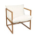 - The Neve Chair in White by MRD Home combines minimal teak design with hand-stitched leather strapping for a sleek look. Featuring a sling seat with a soft, fibre-filled cushion covered in 100% Olefin fabric, it offers both luxury and durability.