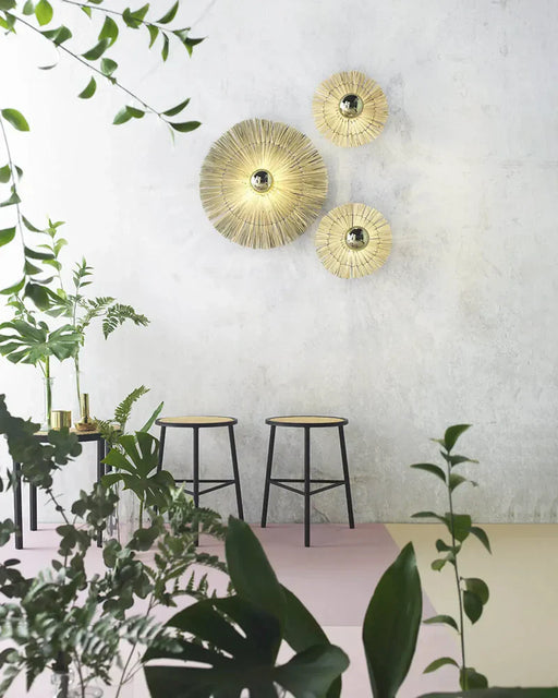 Aromas LightingProduct Description The Line Small Wall Light in Shiny Gold finish by Aromas Lighting features a modern round steel frame with geometric patterns...